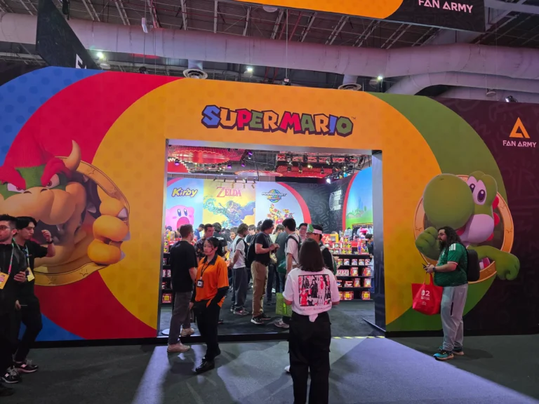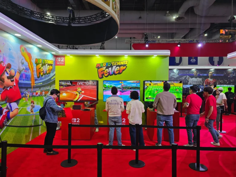 En el booth de Nintendo, tan imponente como siempre, probamos títulos recientes como Donkey Kong Bananza, Mario Tennis Fever y Pokopia. Además, con solo mostrar un código QR de MyNintendo, podías llevarte stickers, gorras, bolsas y más regalitos.