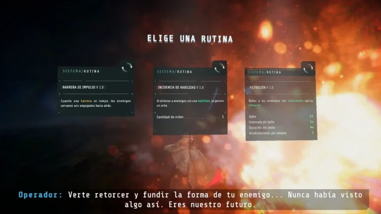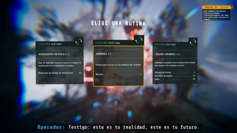 La gracia está en que puedes alternar entre ellos “on the fly”, combinando sus virtudes para mantener la presión. Además, cada enfrentamiento te premia con mejoras: desde drones de apoyo hasta barreras defensivas o efectos como filtración, que daña a los enemigos de manera constante. Elegir bien es clave, porque el juego penaliza repetir acciones y recompensa la variedad con un sistema de puntuación que llega hasta el triple S.